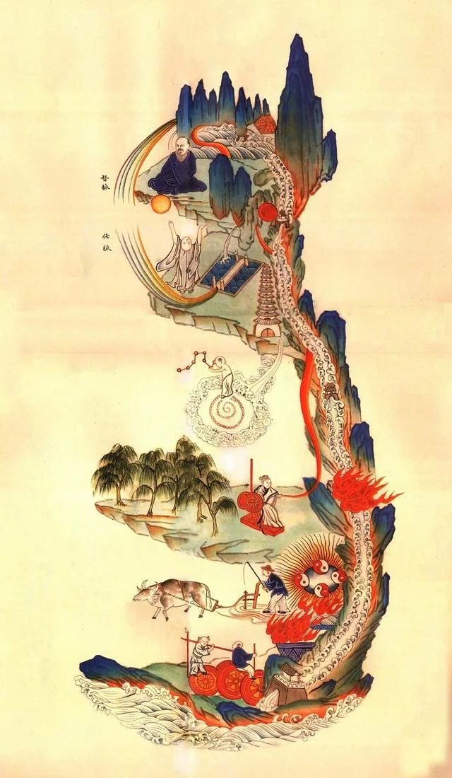 En ce qui concerne les plans intermédiaire et supérieur, les chaudrons celtiques correspondent assez exactement aux Dan Tian : le Dan Tian moyen et le chaudron du mouvement ont à voir avec le coeur, les émotions, la compassion. Le Dan Tian moyen est le lieu où le Qi subit la transmutation qui produira le Shen au niveau supérieur. Cet aspect est intéressant, car selon la médecine chinoise, les émotions ne sont rien d'autre que du Qi; elles sont naturelles, liées à notre physiologie, et ne posent problème que si elles prennent trop de place et perturbent le Shen, justement, ce concept très particulier, très subtil, qui unit dans une même sphère le coeur et l'esprit, et qui occupe donc à la fois le Dan Tian moyen et le Dan Tian supérieur.