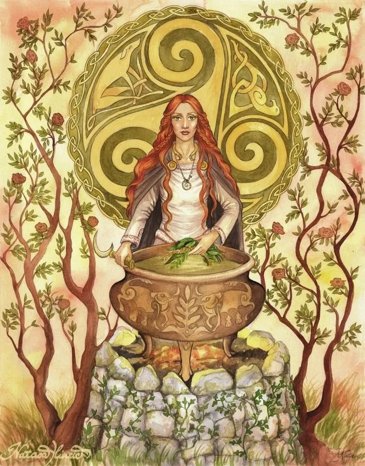 Dans la mythologie celtique, les chaudrons jouent un rôle très important. Certains chaudrons étaient sacrés, et les guerriers considéraient que boire l'hydromel contenu dans ces récipients faisait d'eux des guerriers invincibles (au risque de décevoir ses fans, dont je fais partie, il faut donc admettre que Goscinny n'a rien inventé ....). Le chaudron de Dagda - l'un des principaux dieux celtiques - venait de l'Autre Monde et fournissait de la nourriture en abondance. La chaudron est également l'emblème de Ceridwen, déesse galloise de la renaissance et de la transformation; le breuvage qu'il contient est, sans surprise, une source de sagesse et de pouvoir.