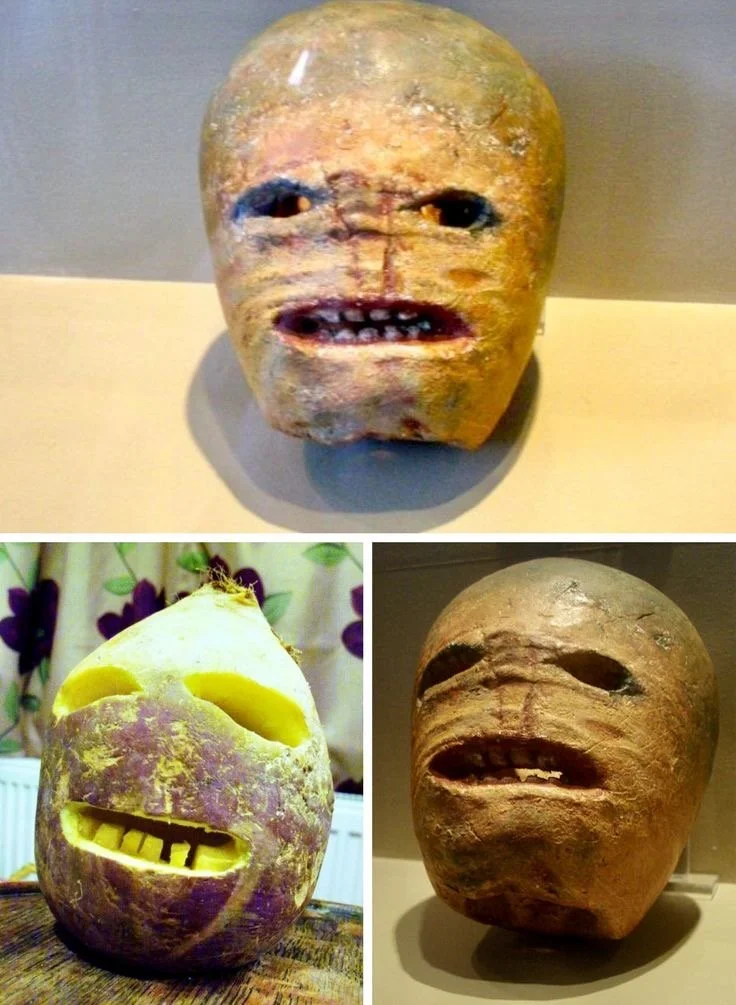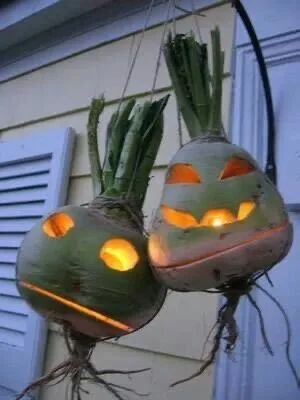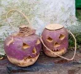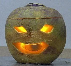 On associe aujourd’hui Samhain à Halloween et à ses citrouilles, et la filiation est réelle. Cependant, Halloween et les citrouilles n’ont fait leur apparition que dans le Nouveau Monde, lors des fêtes organisées par les immigrants irlandais arrivés aux Etats-Unis entre 1845 et 1850 au moment de la grande famine. En Europe, les lanternes (nettement plus terrifiantes) étaient creusées dans de gros navets ou même des pommes de terre.