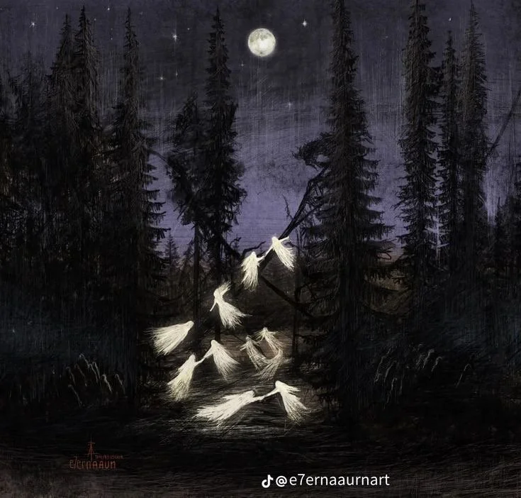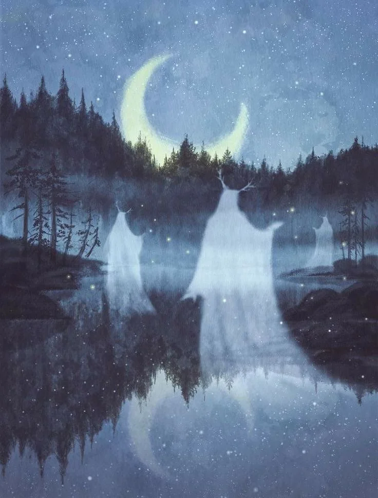 Samhain est un moment de transition, une sorte de vide entre deux mouvements, un temps suspendu, une ouverture …. On dit qu’à cette période, le voile qui sépare les mondes est extrêmement ténu …La date de la fête de Samhain est théoriquement celle de la 11e nouvelle lune de l’année, mais, comme je l’ai mentionné précédemment, elle est généralement fixée à la nuit entre le 31 octobre et le 1er novembre. Il y a en réalité Trois Nuits de Samhain, les trois dernières du mois d’octobre, pendant lesquelles les morts vont pouvoir rendre visite aux vivants, et les vivants communiquer avec leurs morts. Ces échanges donnent lieu à de nombreux rituels, notamment parce qu’ils ne sont pas exempts de dangers : les chers défunts retrouvent brièvement leurs familles, mais d’autre créatures moins bienveillantes peuvent également se glisser entre les pans du voile.