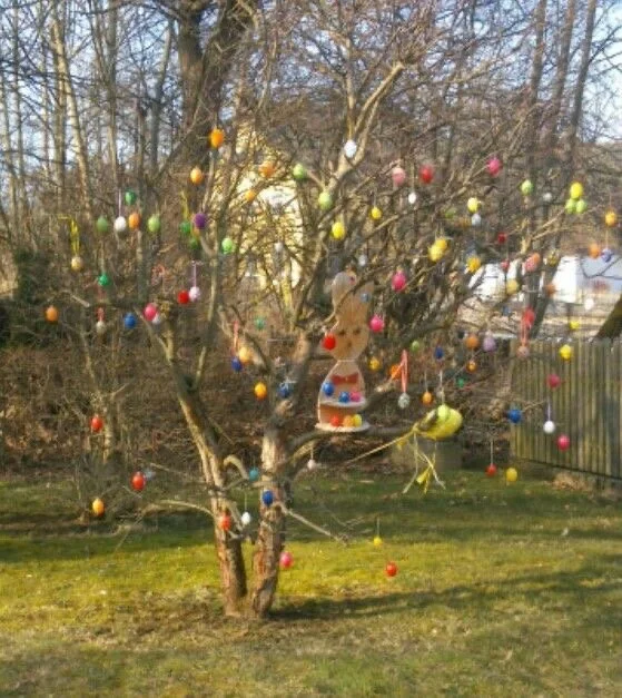 On dispose des branches en bourgeons dans un vase et en y suspendant des décorations en forme d’oeufs, de lapins, de poules, etc…. ou alors en décorant de la même manière un arbuste du jardin…