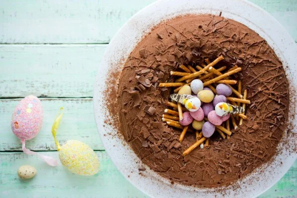 et pour le décor : petits oeufs en sucre, copeaux de chocolat, vermicelles colorés, etc…