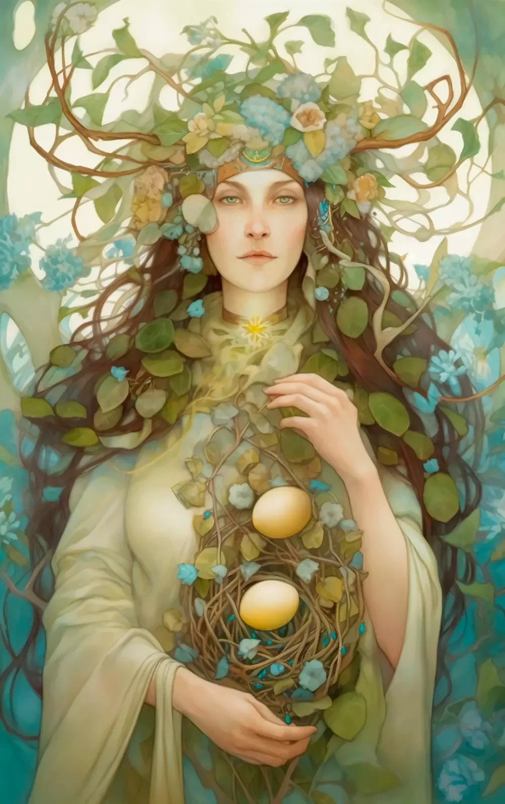 La fête d’Ostara est donc célébrée en l’honneur d’une toute jeune déesse, couronnée de fleurs et vêtue de blanc, qui gambade dans les prés au milieu des jonquilles, entourée de lapins, de poussins et d’agneaux. Cependant, le retour de la fertilité de la Terre ne saurait se passer d’un jeune dieu, le Nouveau Soleil qui réveille la déesse, ou l’Homme Vert, souvent représenté vêtu de feuillage, et associé au Roi Chêne qui a repris les commandes lors du solstice d’hiver. Lui aussi est plein de vigueur, mais encore très chaste … jusqu’à Beltaine.