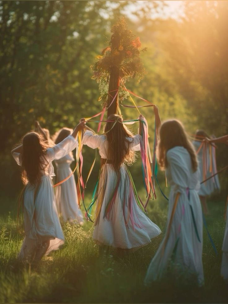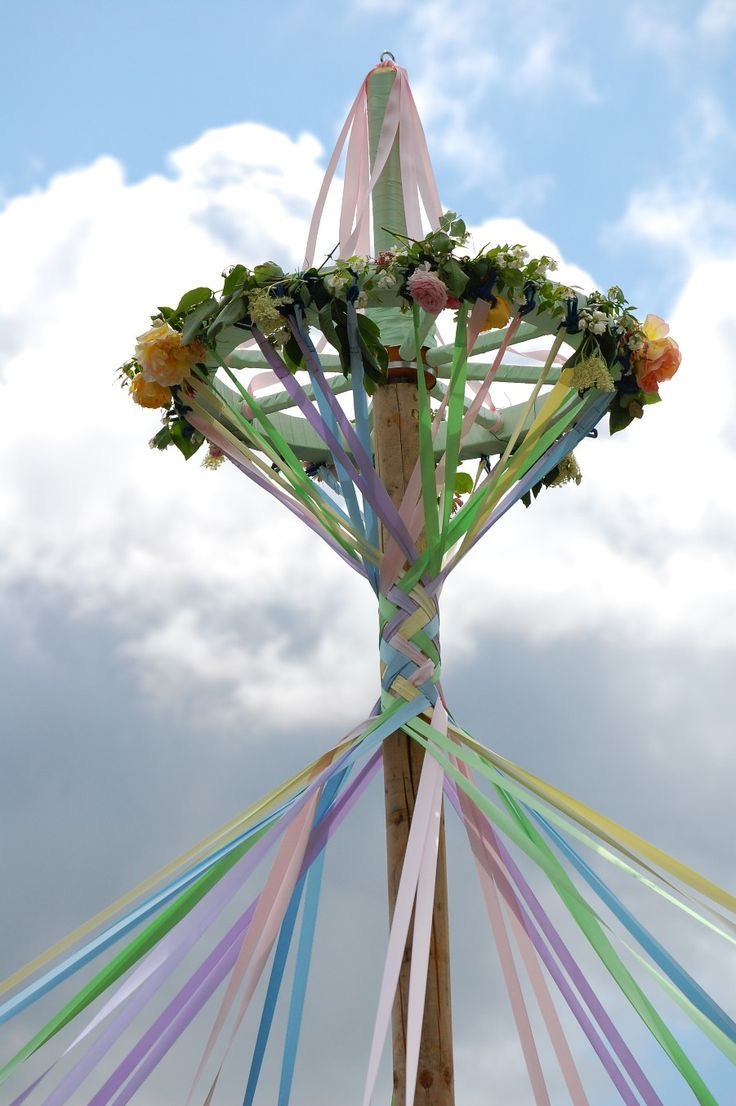 Le mât de mai est une autre tradition caractéristique de Beltaine. Un tronc de bouleau était dressé au milieu d’un champ, avec à son sommet une large couronne de fleurs d’où tombaient de nombreux rubans colorés.