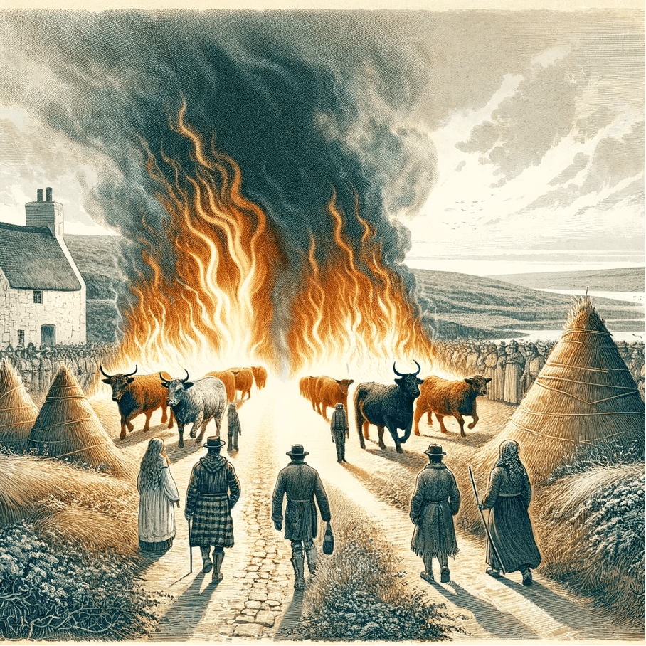 La tradition spécifique de Beltaine consistait à faire passer les troupeaux entre deux de ces grands feux sacrés, pour les protéger des maladies et des épidémies pendant le reste de l’année. Cette tradition a perduré en France et dans les îles britanniques jusqu’au début du XXe siècle.